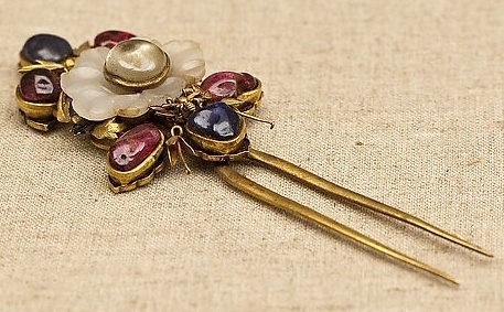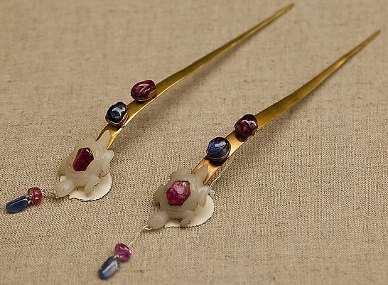 明弘治镶羊脂玉红蓝宝石金累丝簪
