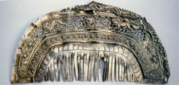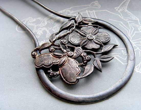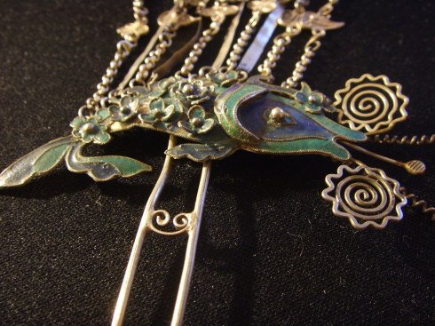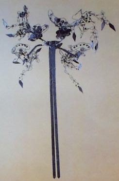 簪起源于新石器时代至商周时期,簪的材料以骨为主,汉代开始出现象牙簪、玉簪,还在簪头上镶嵌绿松石。唐宋元时期的簪则大量用金、银、玉等贵重材料制作。银簪的制作工艺有錾花、镂花及盘花等,盘花是用细银丝编结而成。簪头的雕刻有植物形,动物形,器物形等,其图案多具有吉祥寓意。另外簪头造型做扁平一字型的成为扁方,原为满族妇女用的大簪,也是簪的一种。