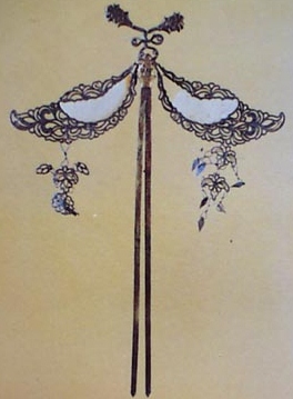 钗: 钗和簪的作用相同,都是用来插发的,但不同的是,簪是一股,而钗则是双股。钗流行于西汉晚期,一直是女子的主要头饰之一,即便是如今,钗在梳妆品中仍有一席之地,比如发夹,就是从发钗演变来的。
