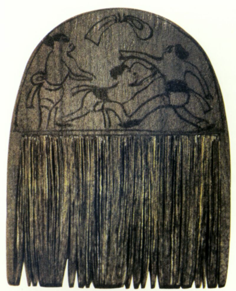春秋以前的梳子,不论形制多么复杂,装饰多么考究,它们的外形特征基本一致,都是直竖形,梳把较高,横面较窄,很少作方形或扁平的。从战国到魏晋南北朝,梳篦的材料一直以竹木为主,尤以木料最常见。