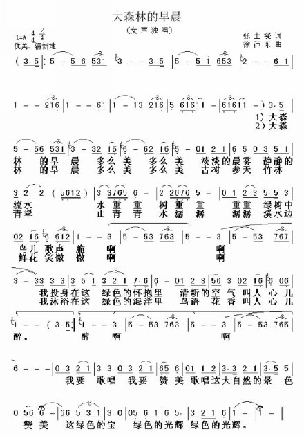 全曲为两段式结构,第一乐段节奏平缓、曲调优美,对大森林中的晨雾、流水、古树、竹林、鸟儿、鲜花等进行了描绘;第二乐段利用弱起的节奏、悠扬的曲调和自由的延长音,把人们带到如诗如画的美丽大森林中.
