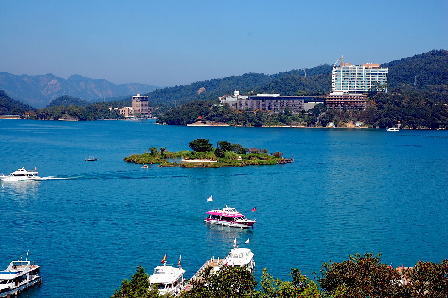 位于南投县鱼池乡水社村,是台湾唯一的天然湖,由玉山和阿里山之间的断裂盆地积水而成。湖面海拔760米,面积约9平方千米,平均水深30米,湖周长约35千米。日月潭四周群山环抱,重峦迭嶂,潭水碧波晶莹,湖面辽阔,群峰倒映湖中,优美如画。每当夕阳西下,新月东升之际,日光月影相映成趣,更是优雅宁静,富有诗情画意。日月潭中有一小岛远望好象浮在水面上的一颗珠子,名珠子屿(光华岛),以此岛为界,北半湖形状如圆日,南半湖形状如弯月,日月潭因此而得名。