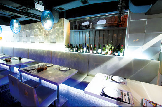 在位于被誉为佐敦苏豪区的山林道,Oyster Express即使在众多中式、西式及亚洲各国等美食店和型格的酒吧中也极易辨认。除了醒目的招牌以外,透明玻璃设计的厨房让人一眼就可以看到放于冰台上的各种生蚝。店内装潢简约清新,以纯白色桌椅、墙壁衬蓝色吊灯,大约能容纳30余人的小店顿时显得空间感十足。“因为座位不多,晚饭时间客人常常需要等候两轮才能进入。”山林道店的负责人Rainbow说。
