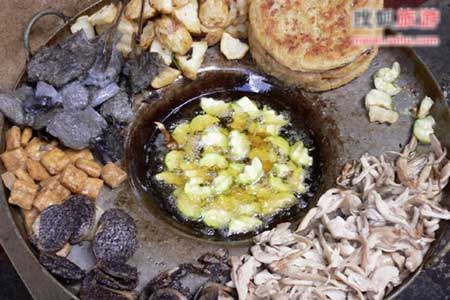 菜名菜单:大红肉、烤鱼、酥油茶(甜咸两种)铜锣锅焖饭、水焖粑粑,丽春火锅:从下往上分八层,分别为: 腊排骨、芋头、茨姑、豆腐、韭菜根、粉皮、粉丝、青菜(代辣子蘸水)