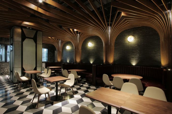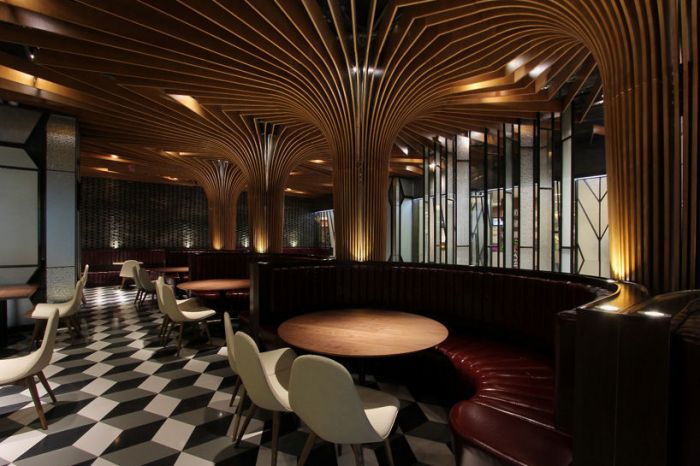 这是一家位于云南昆明的港式茶餐厅,设计方来自中国设计师刘昊威带领的 CAA(Core of Architecture & Art Associates)团队。他们使用了竹子作为材料,搭建出西方古典的拱形结构,从墙壁蔓延至屋顶。餐厅的中间同样用竹子装饰了立柱,在接近天花板时打开,有参天大树的形态。