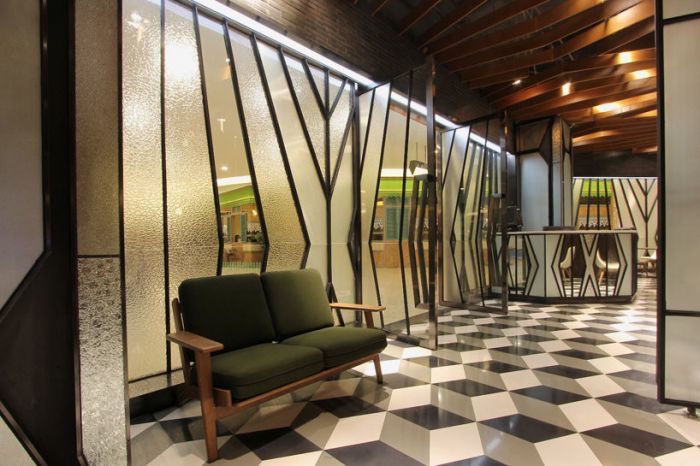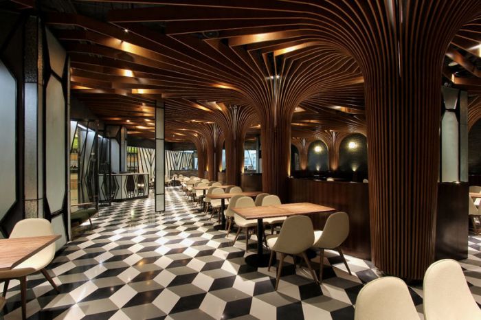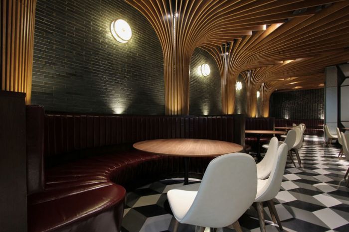设计师刘昊威称他们的灵感来源于竹编,“竹子是传统的亚洲的材料,但它可以设计得非常现代。”而竹编元素与西方建筑的拱形结构融合,赋予餐厅开放的氛