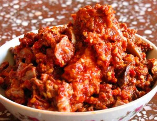 一种荤腌制品,并不是用猪肝,而是用猪肋骨,撒上盐加上当地出产的花椒面、辣椒面、老姜丝、白酒、草果、八角、茴香籽等,放到瓦罐里腌制而成。吃的时候用没有沾过油水的筷子夹出来,放到饭甑子上蒸了吃,可以作调料炒菜炒肉煮鱼吃,也可以单吃下饭。无论是炒、炸、溜、煮都是香气袭人,辣香四溢。不知道这道美味和云南其他地方称为“骨头参”的东西是不是就是一种。