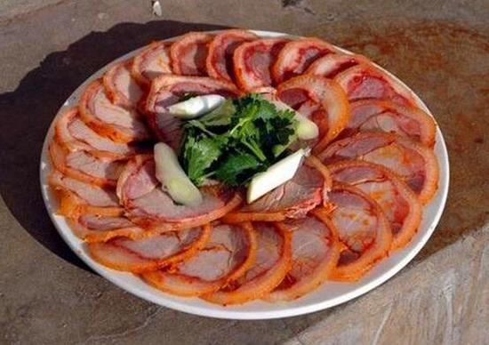 卷蹄味道微酸,可贮存8-10月而色味不变,贮存时间越长,味道越美。做法是将猪蹄里的骨头用特别的方法抽挑出来,将皮肉卷起,抹上各种调味品并用棉线绑住腌制,吃的时候,皮肉已再次“连”为整体,成为一卷,只需切成片,蒸熟即可。当然这个做法纯属个人推测……