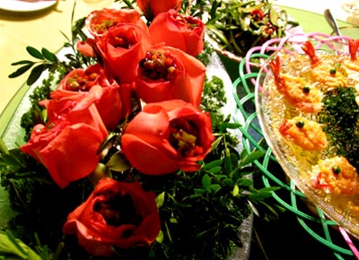 石榴花在云南也是一道美味佳肴。将新鲜石榴花的花蕊去除,保留它的花瓣部分,然后将处理好的石榴花泡在盐水中,腌制一段时间,目的是为了去除花中的涩味。泡上一两天之后,花就变成了淡黄色,而且变软,这时把花洗净,挤去大部分的水分,就可以炒了。炒石榴花的配料主要有韭菜和干辣椒。先把辣椒下油锅略炒一会,等辣椒香气出来之后放入石榴花,最后再加入韭菜段和盐调味就可以出锅了。成菜香气宜人,口感咸香可口,略有一丝苦味。但苦在这道菜中会让人上瘾,停不下嘴,由于石榴花有清热、解毒、健胃、润肺、涩肠、止血等功效,在一边品尝美食的同时也达到了排毒的目的,真是一举两得的美差。