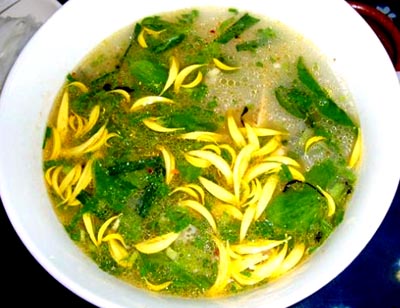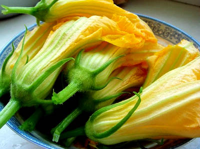 南瓜花也是云南少数民族的桌上佳肴。南瓜花以清晨采摘的为佳,或在雄花传粉之后的中午之前采摘,将嫩瓜尖摘下来,上面有南瓜花和小小的南瓜,洗净后一同煮汤喝,这碗汤,黄花黄得透亮,瓜尖绿得晶莹,还有圆鼓鼓的小南瓜,其味清鲜嫩爽,色彩鲜艳,使人食欲顿增。在大理白族地区,当地人用南瓜花做成一种叫“囊煎”的食品,食之终身难忘。当地人采了南瓜花,除去花粉,然后用铜锣锅焖一锅糯米饭,等糯米饭焖出来,放凉了它们,加进化油、陈皮、花椒、辣子粉等佐料,将这些糯米砣做成南瓜花朵大小,用南瓜花包了它们,再放油锅里煎,这就是形象生动的囊煎来由了。在西双版纳景洪的大大小小傣家餐馆中,有一款“南瓜花肉馅包”的小食名气最大,其原料用南瓜花、五花猪肉、葱、蒜、盐等食材配料,制作时将猪肉去皮洗净,再把南瓜花和肉剁在一起,然后把切好的配料放在肉里拌匀,把蒸好的肉馅分成若干份,每份塞进一朵南瓜花里包好,用竹片夹住放在火炭上烘烤,而不烤焦;再将滚烫的猪油浇在烤熟的南瓜花上,等油滴滤干以后南瓜花肉馅呈深黄色,切开后喷香味甜,吃起来别有风味。