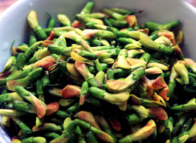 金雀花在云南是再常见不过的了,人们将金雀花去蒂后漂洗,然后与鸡肉一同拌入鸡蛋清内炒,白肉中缀黄花,入口异常鲜美。还有一种做法是把金雀花与鸡蛋同炒,再撒上熟云腿粒,这道菜名为鸡茸金雀花,白蛋中镶黄花,红色的肉好似蕊一般,放入盘中,倒似一朵花,也是一道十分美丽可口的菜。金雀花不仅好吃,还是一味良药,通常的说法是滋阴和血,健脾祛风,治头晕头痛,耳鸣眼花。《滇南本草》中也有记载:“主补气补血,劳伤气血,寒热痨热,畏凉发热,咳嗽,气虚下陷者良效”,如今在许多成药物中可见含有金雀花的成份。