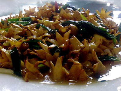 清秀的玉荷花在云南也是名菜,其花瓣大,有肉质感。用沸水焯一下,用笊篱捞起,花嫩如脂,滋润清香。玉荷花是花之君子,自然不与肉类为伍,放几根春韭便新鲜得人不肯歇筷了。赏花者是诗人,吃花者如神仙,花入口,便似是花也开在了肚里,万千诗篇涌来,却一句也不觉得好,唯“清幽”二字当得。