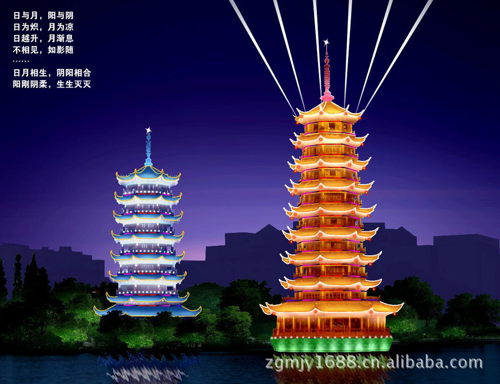 “三潭印月”的美景——春,秋景色尤佳;每逢仲秋时月光、灯光、湖光交相辉映,夜景十分迷人。