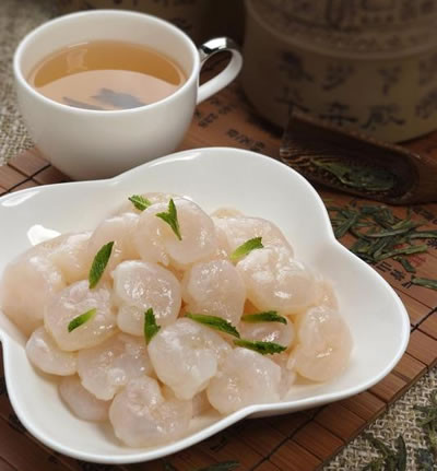 龙井虾仁,顾名思义,是配以龙井茶的嫩芽烹制而成的虾仁,是富有杭州地方特色的名菜。虾仁玉白,鲜嫩;芽叶碧绿,清香,色泽雅丽,滋味独特,食后清口开胃,回味无穷,在杭菜中堪称一绝。 据说,清乾隆皇帝下江南时,正好是清明节。他游览了西湖龙井,茶农将新茶进献给他,他带回行宫,御厨在炒“玉白虾仁”时放进茶叶,烧出了这道名菜。不久,“楼外楼”菜单上,就出现了“龙井虾仁”这道名菜。聪明的厨师把龙井茶叶入馔,大概是受了别的西湖名菜的启发,而在烹调技艺上进行的一次大胆创造。这个菜,不仅用料别出心裁,火候也必须掌握得恰到好处。制作时,厨师用油滑锅再下熟猪油后,立即放入上过浆的虾仁,约滑15秒钟,就倒入漏勺沥去油,再同用沸水泡过的新茶一起下锅,用料酒一喷,在火上一颠,就起锅装盘。功夫就是在这一转眼中把这道名菜烧出来。