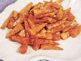 特 点:干炸响铃色泽黄亮,形如马铃,松脆爽口。