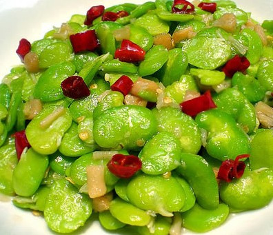 制法:1、将蚕豆除去豆眉,用冷水洗净,在沸水中略焯。熟火腿切成0.3厘米厚、1厘米长方的丁。
