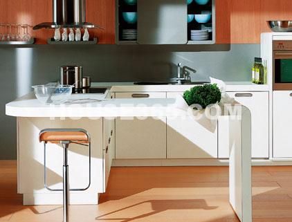柔和、素雅的颜色和简洁大方的造型,适合不同风格的居室空间。利用厨房有较宽直径这一优势,打造出的餐台既延续了橱柜的设计,也为就餐提供了方便。