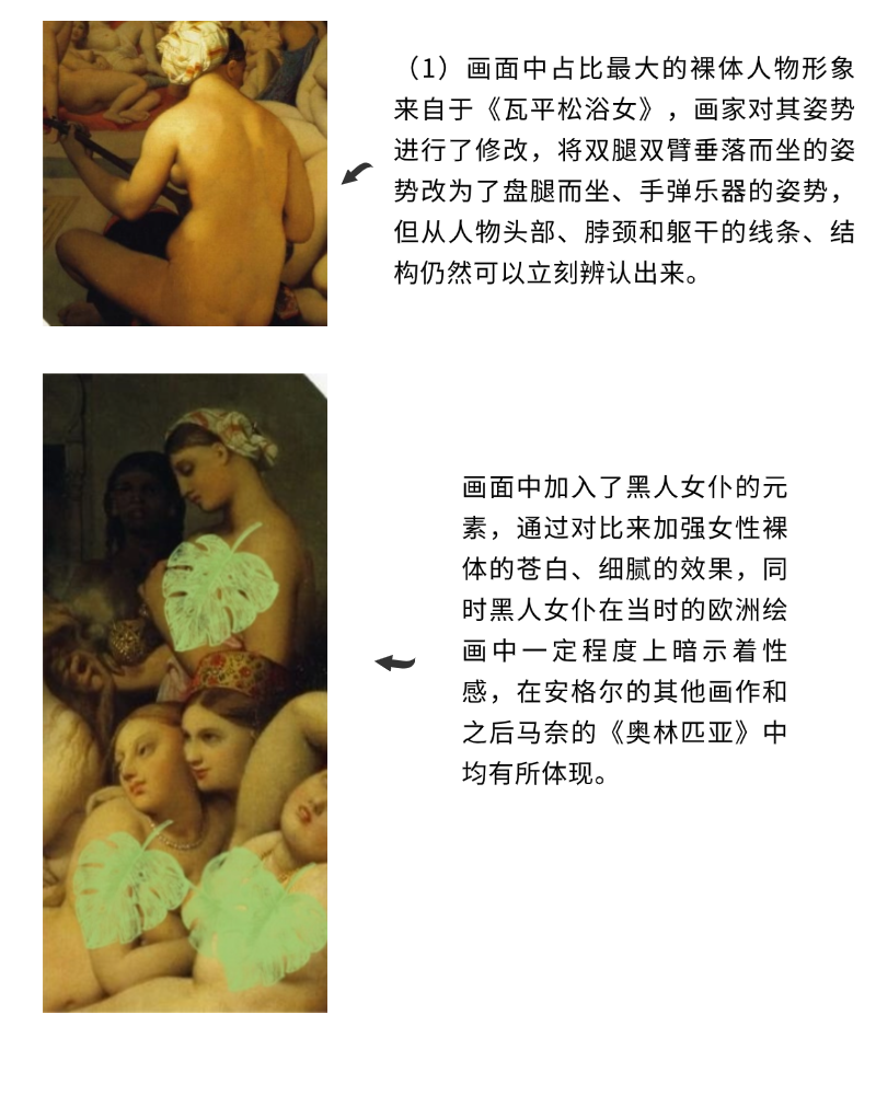 背景中面向观画者站立的浴女原型是画家的第二任妻子戴尔芬·拉梅尔,她的右臂和肩膀的结构并不符合人体解剖学,这也是安格尔独特的美感表现。