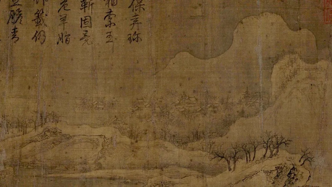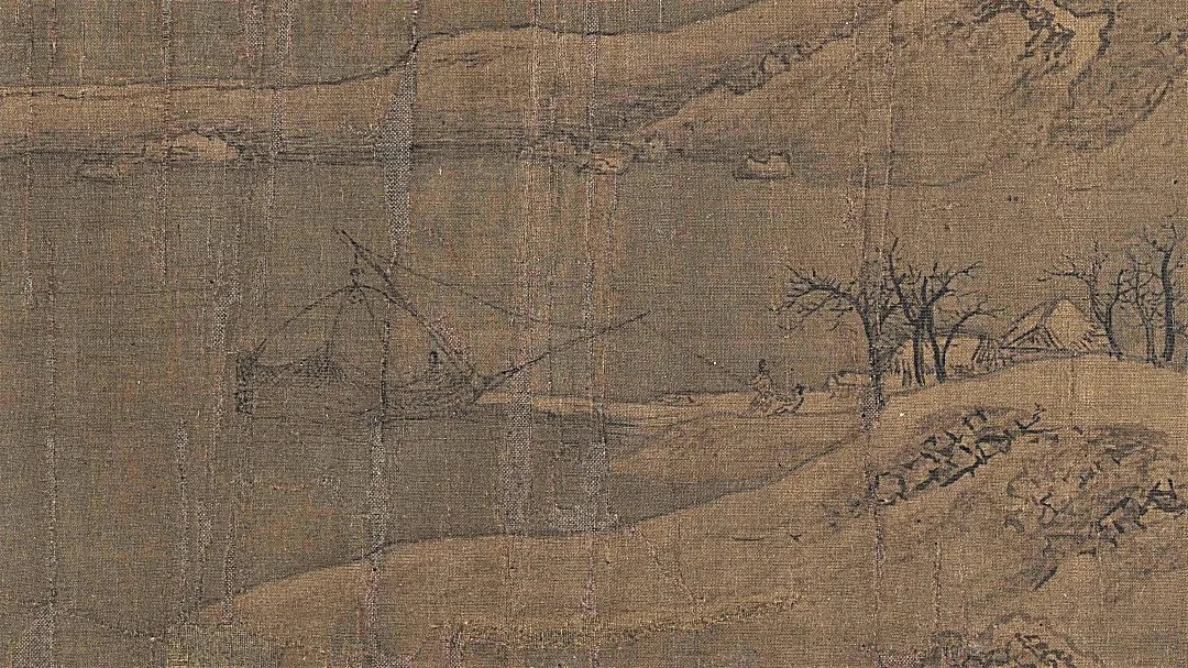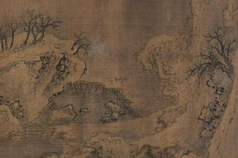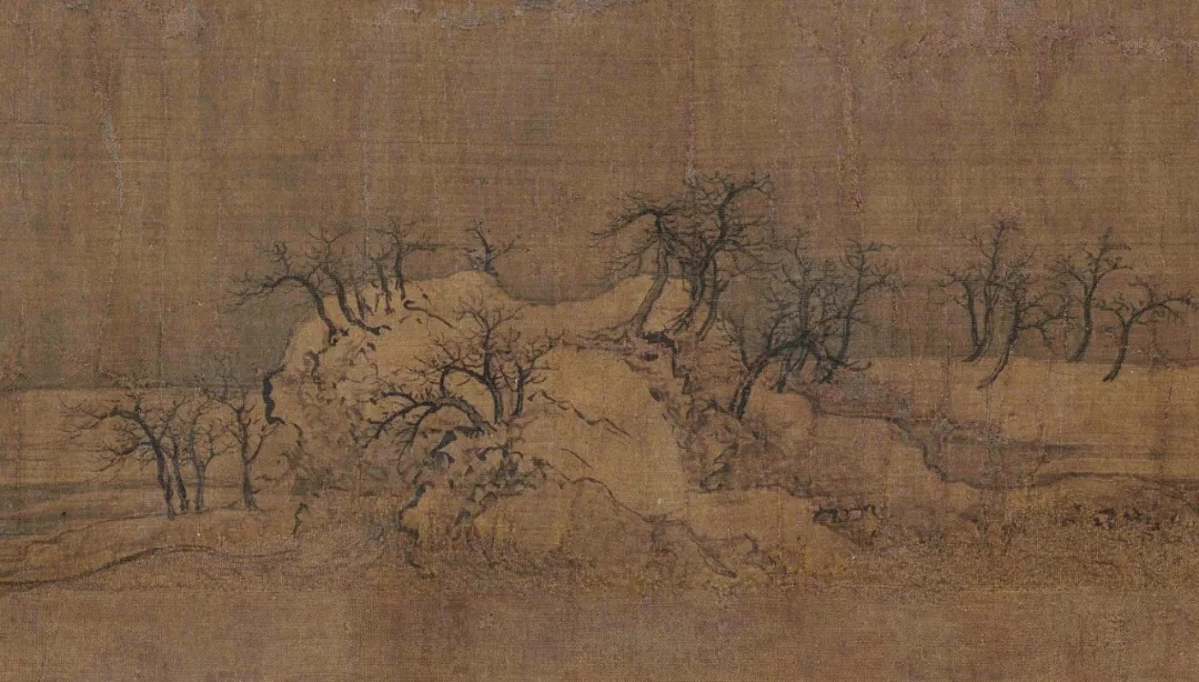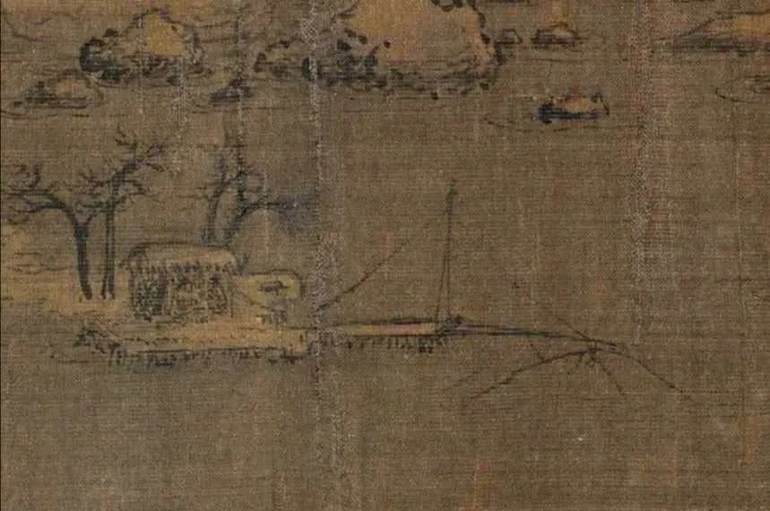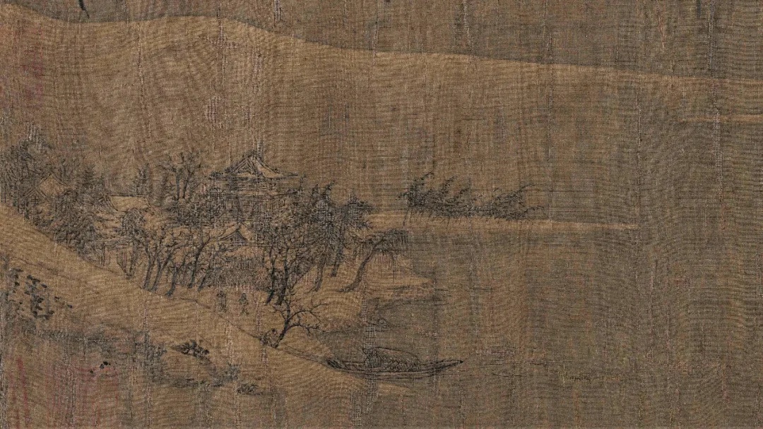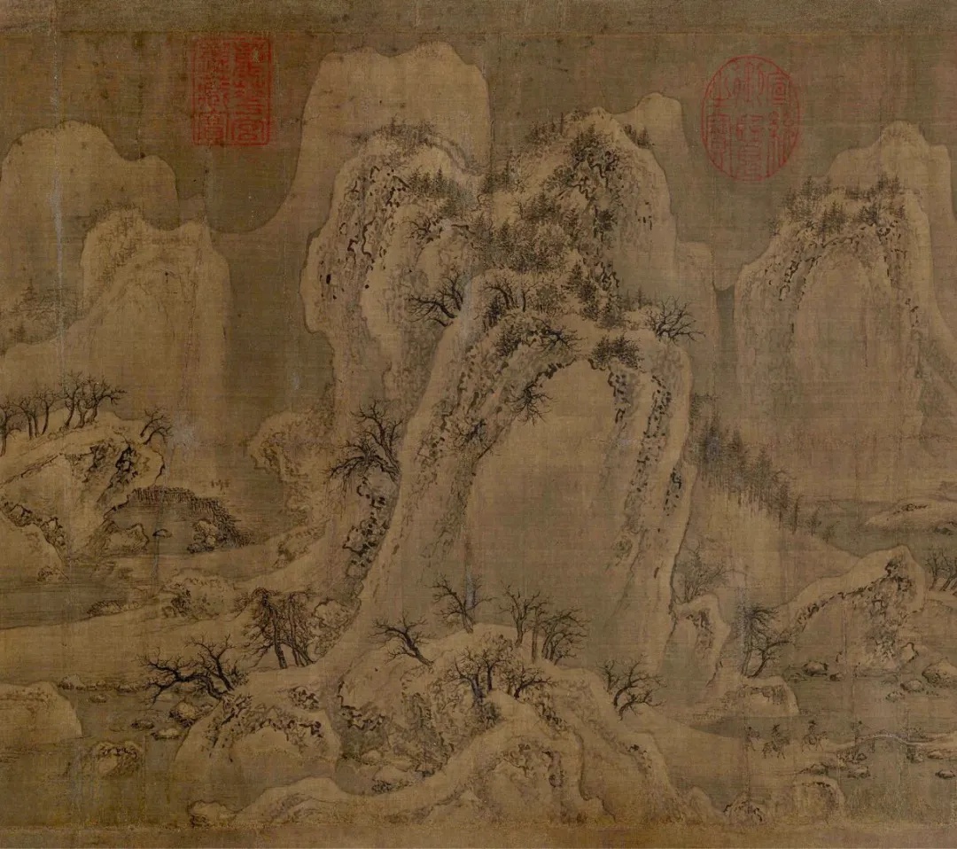 《雪江归棹图》画面起首——远山平缓,进入中段以后——山势渐渐高耸,转而趋于平缓;整幅画面富有高低错落的节奏感,使观者仿佛身临其境。