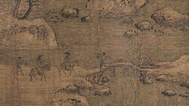 画中点景山人物:渔夫、山樵,劳作;文人踏雪、商旅行路——一派祥和的桃源境界。
