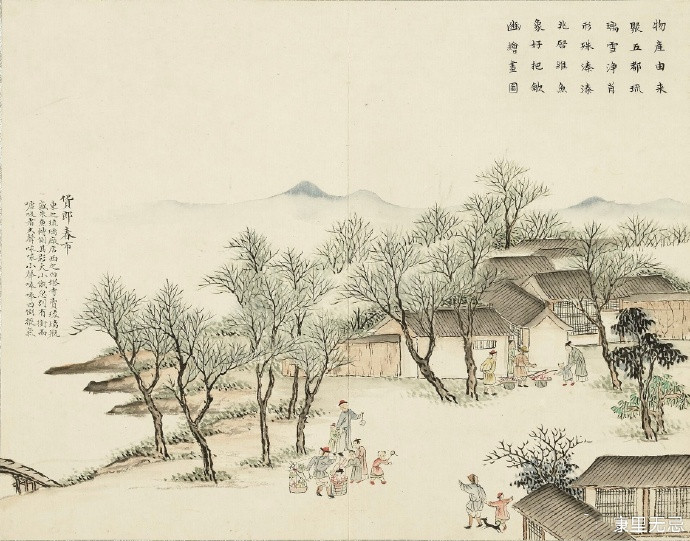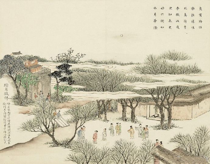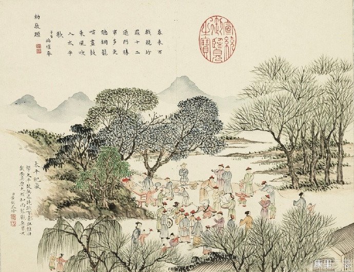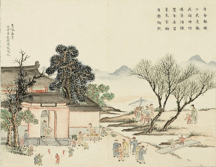 击太平鼓无昏晓,跳百索无稚壮,戴面具耍大头和尚,聚观无男女。臣黄钺恭绘。