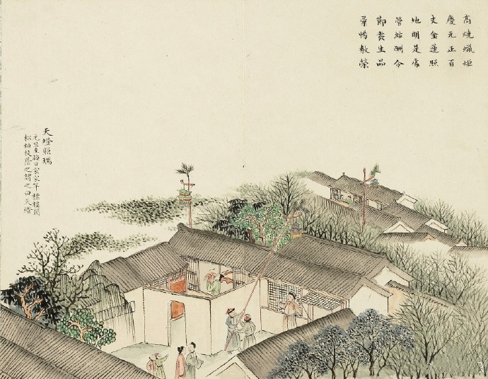 元旦至晦日,家家竿标楼阁,松柏枝荫之,谓之曰“天灯”。
