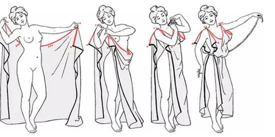 古希腊祖宗的日常服饰,就是长袍。上图演示了古希腊人袍子的穿法