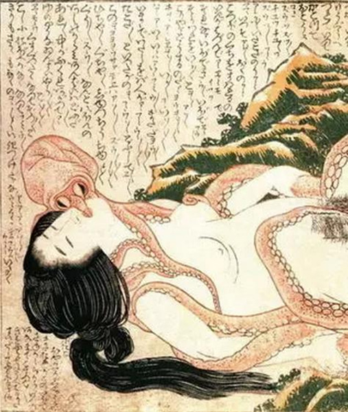 这幅《海女与章鱼》表现的就是一只章鱼爬上了一位女孩的身体,用它的触手探寻,此时它的头部正吮吸她的下体。这几乎是对痛苦和悲伤的惊人的表达,使高挑曼妙的带有高鼻梁的女子振动不已,以及歇斯底里的喜悦。从她的额头、如同死亡一般紧闭的眼中散发出来……