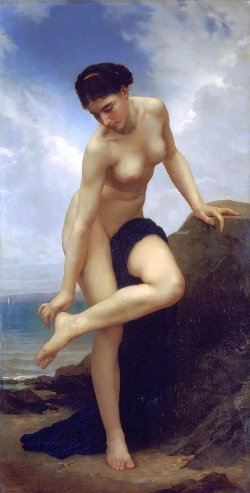 法国画家William-Adolphe Bouguereau威廉·阿道夫·布格罗于1879年创作的一幅布面油画,这幅作品描绘了一位沐浴后的女子,她优雅地坐在岩石上,专注地擦拭自己的脚。画作展现了布格罗典型的精细写实主义风格,并融合了古典主义与浪漫主义的美学特点。