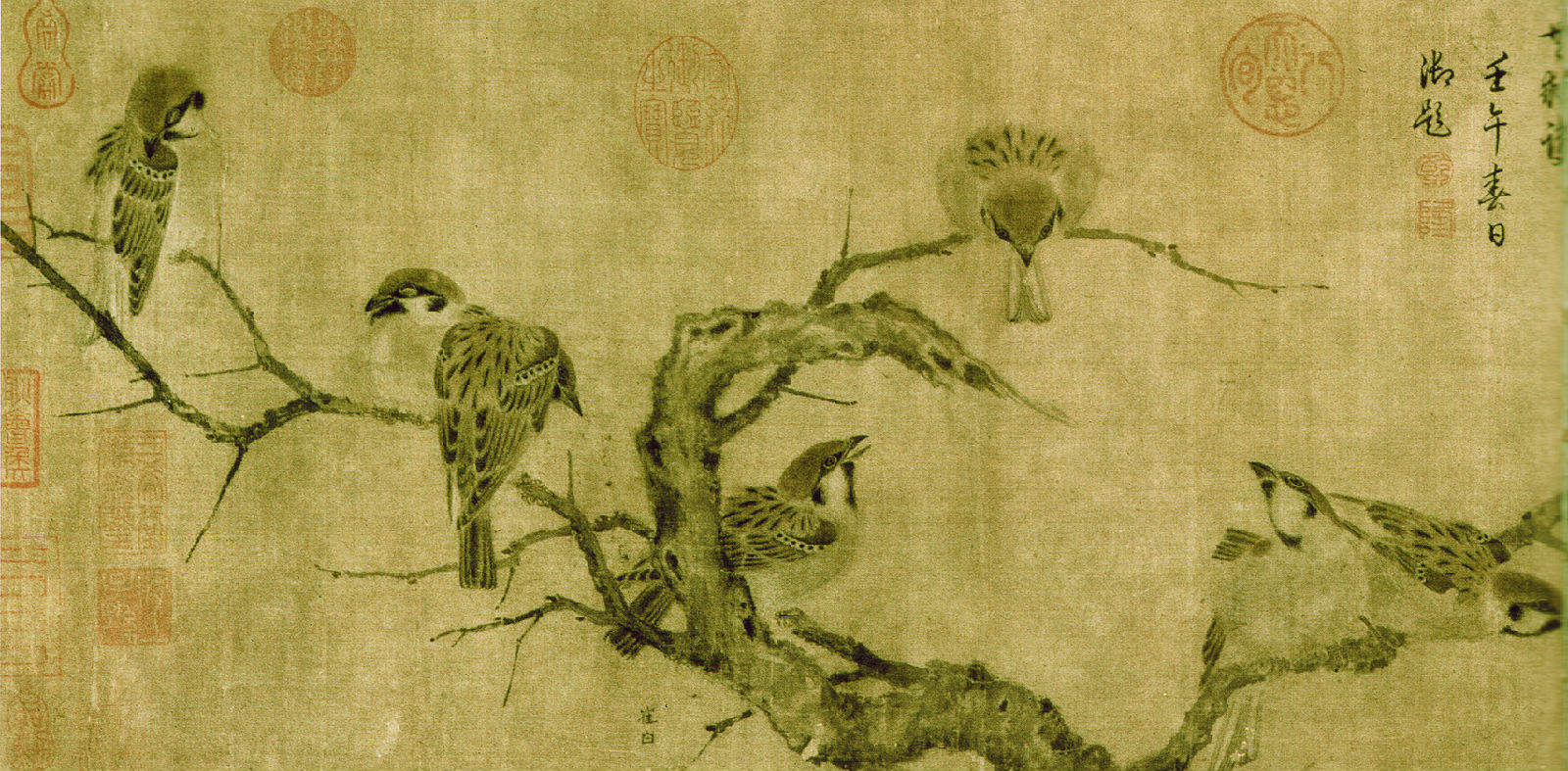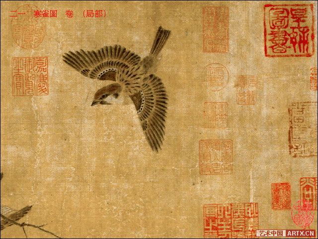 九只麻雀集于一图,八只栖于枝上,或正或侧,或俯或仰,或相互依偎,或相互顾盼,更有一只自远处飞来,使画面又别生动感。九只再普通不过的小鸟,一经入画,是如此鲜活灵动,可鉴其情,似闻其声,充满了诗情画意,于质朴中昭示淳美,引领一股旷野清风,一扫宫廷画苑的靡丽柔弱之习。左起第四只麻雀尾下有“崔白”款识。