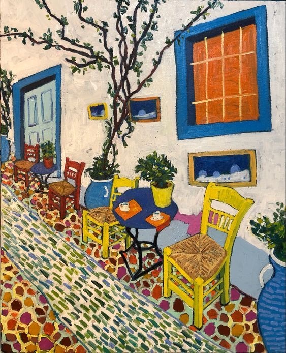 这幅画名为希腊咖啡馆,由艺术家大卫·施拉布创作。画面以地中海的明亮色调展开,露天咖啡馆的桌椅与建筑在光线中跳跃,形成一种近乎梵高式的色彩脉动。蓝色、黄色与红色在画面中彼此呼应,让人仿佛听见远处海浪拍击岸边的声音。