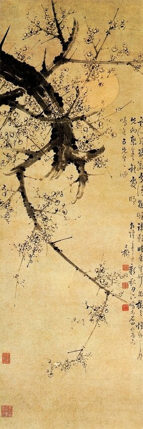 童钰(1721-1782),浙江绍兴人。擅山水,尤 擅写梅,宗扬无咎法。此图为作者的传世之作,运笔密而不乱,繁而不杂,墨气雄厚。一轮圆月, 影照梅花,分外清逸。