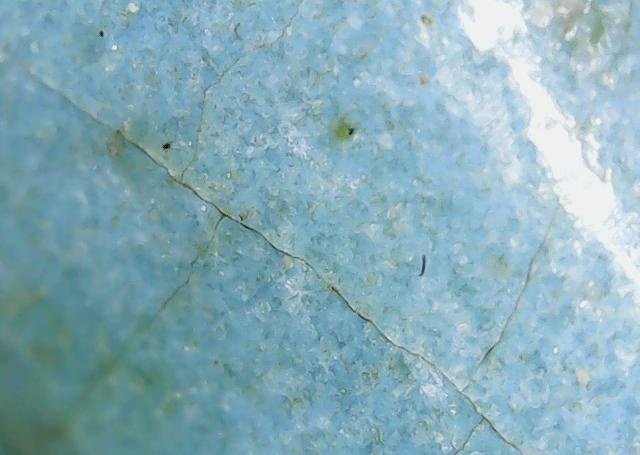 瓷器烧造过程中,若温度出现改变,由高温降为低温,此时由於釉层与胎层的收缩度不同,正是产生开片的主要原因。院藏一件「北宋汝窑青瓷水仙盆」(图)是传世唯一一件不带开片的汝窑瓷器,藉此机会,我们对其进行显微观察,并记录釉面的特征加以拍摄。至於另一件形制相同却多处带开片的水仙盆(图),经过显微观察后发现全器多处可见开片。通常开片发生的部位,气泡常易破裂,裂纹因污渍的渗透呈现暗褐色(图)。釉面上的冰裂开片(图),每一道冰裂纹造成的区块在光学显微镜下竟然呈现出不同亮光。
