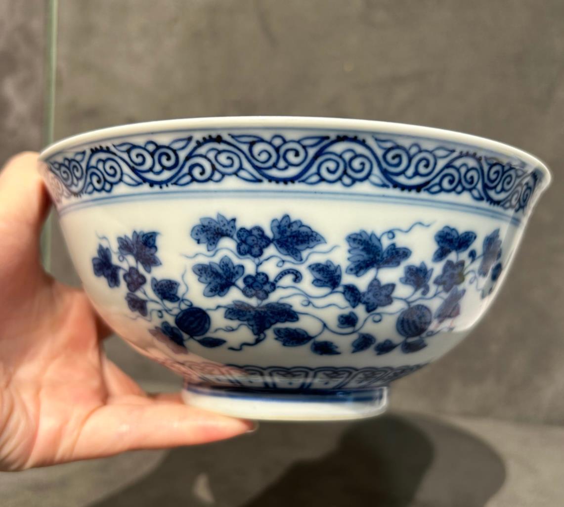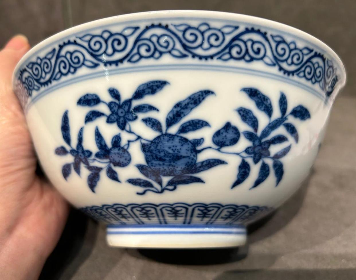 咱们看看这只青花碗,腹部绘有石榴、寿桃、瑞果纹。其实按传统三多纹来讲,是要绘制佛手、桃、石榴。
