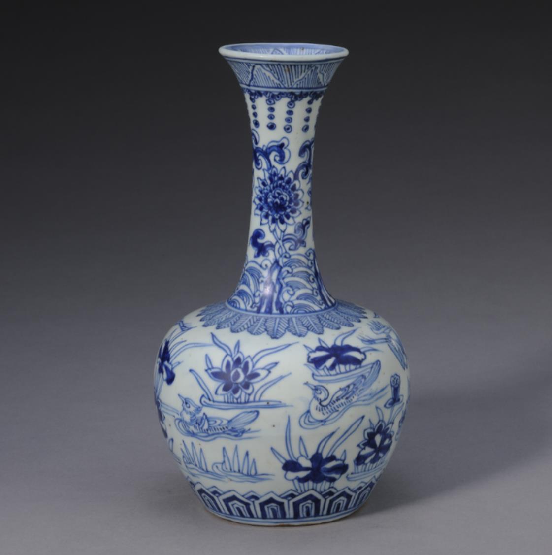 因为鸳鸯都是成对的生活在一起,自古人们便把鸳鸯视为纯洁爱情的象征。青花中鸳鸯多与荷塘相配,且都是成对出现,是汉族传统吉祥纹样,寓意爱情美满,出双入对。