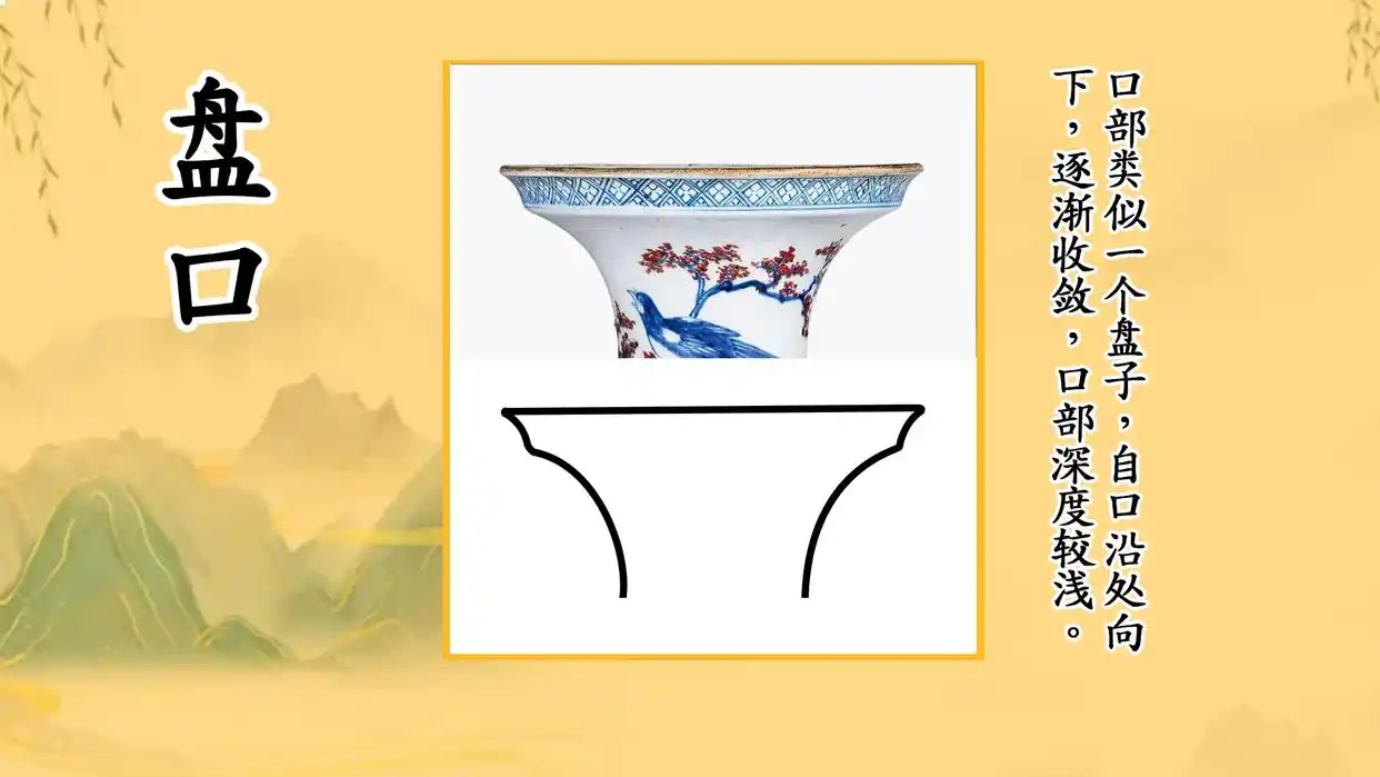 盘口,口部类似一个盘子,自口沿处向下,逐渐收敛,口部深度较浅。