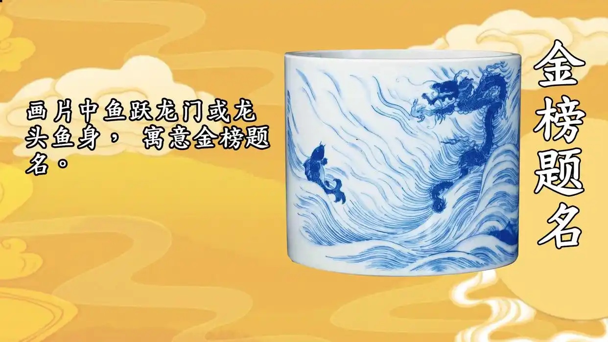 金榜题名。画片中鱼跃龙门或龙头鱼身,寓意金榜题名。