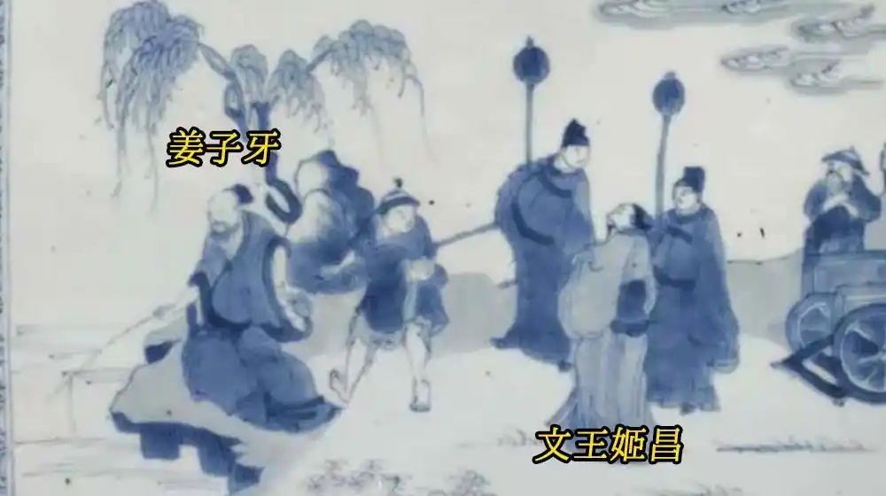 特征:画片中一老者端坐河边垂钓为姜子牙,身后有主仆数人站立,主为文王姬昌。