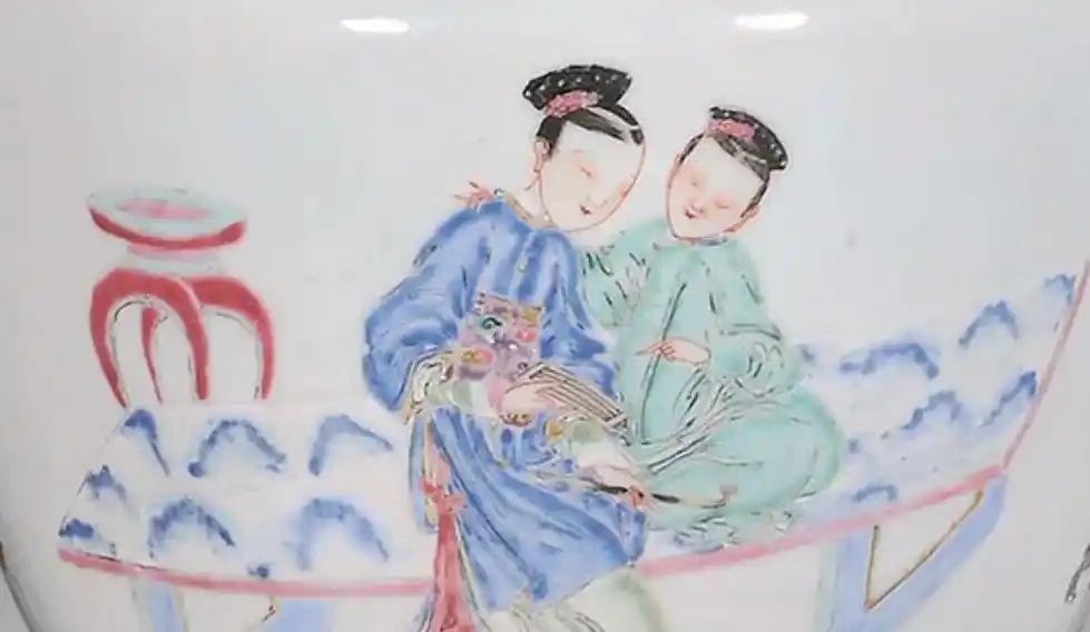 特征:画中仅有两妙龄女子,或站或坐,其中一人手捧书籍,二人共读。这里多说一嘴,现代手绘瓷,很多画工把画片中的书给省略了,这是不对的,书都没了,二乔还读个啥。
