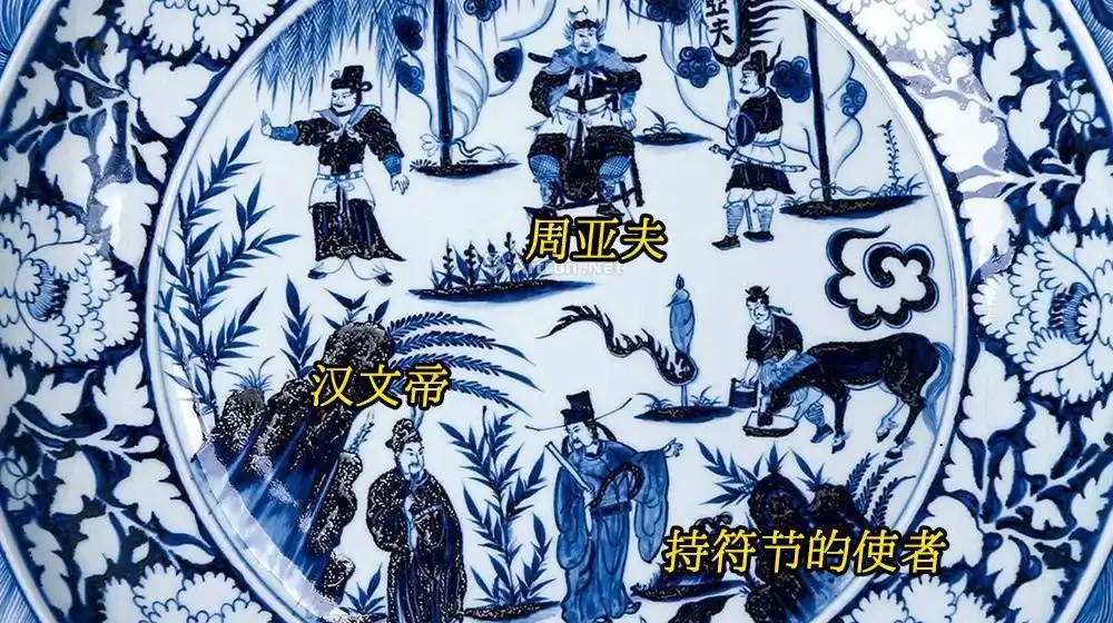 画片特征:周亚夫身着甲胄端坐军营,武将模样。文帝身穿长袍站立,身边跟随仆从,画片背景有柳树。