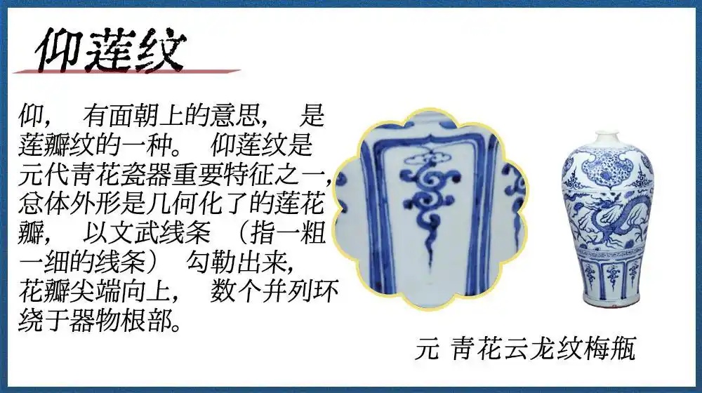 仰莲纹。仰,有面朝上的意思,是莲瓣纹的一种。仰莲纹是元代青花瓷器重要特征之一,总体外形是几何化了的莲花瓣,以文武线条(指一粗一细的线条)勾勒出来,花瓣尖端向上,数个并列环绕于器物根部。在绝大多数元代青花器物的根部都有仰莲纹装饰。