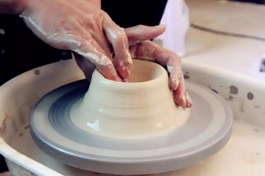 轮制法,是指将泥料放置在轮车上,通过旋转泥料,双手挤压使之成型的制作工艺。