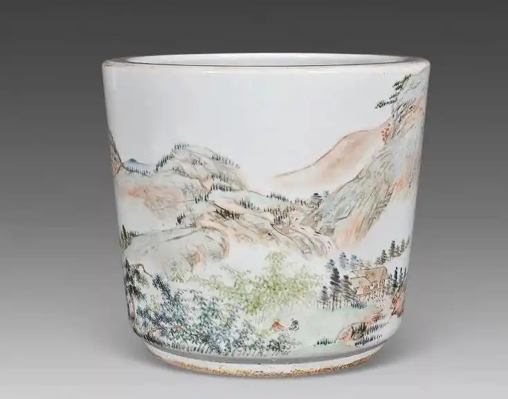 浅绛彩,清代晚期至民国时的釉上彩新品种。以黑色颜料在白瓷上勾勒山水人物线条,后再绘上淡赭、花青、淡蓝等颜色,经低温烧制。浅绛彩将中国书画艺术完美的展现在瓷器之上,算的上是瓷器艺术的新创举。