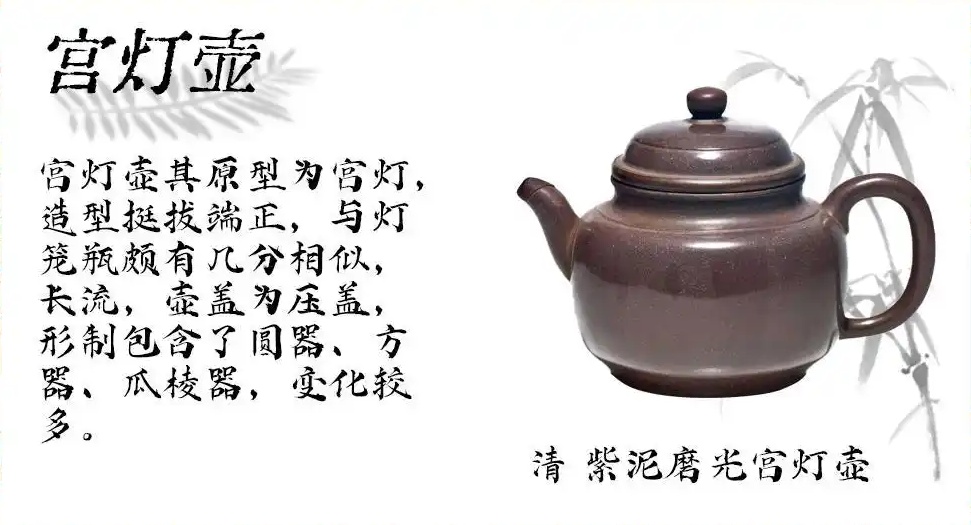宫灯壶。宫灯壶其原型为宫灯,造型挺拔端正,与灯笼瓶颇有几分相似,长流,壶盖为压盖,形制包含了圆器、方器、瓜棱器,变化较多。