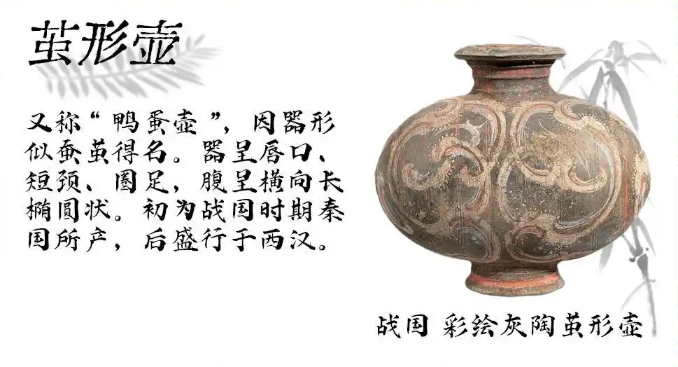 茧形壶。又称“鸭蛋壶”,因器形似蚕茧得名。器呈唇口、短颈、圈足,腹呈横向长椭圆状。初为战国时期秦国所产,后盛行于西汉。