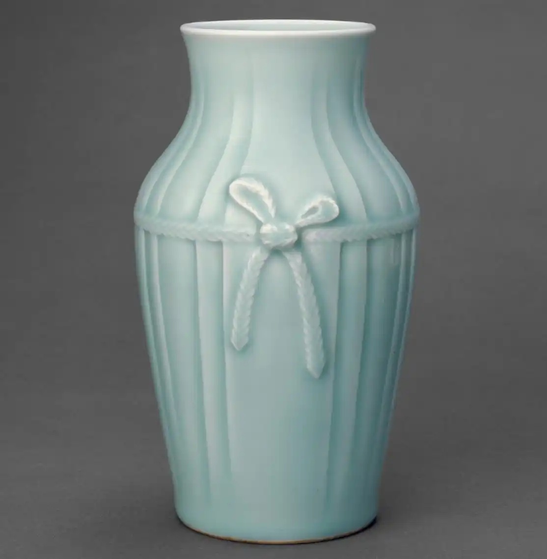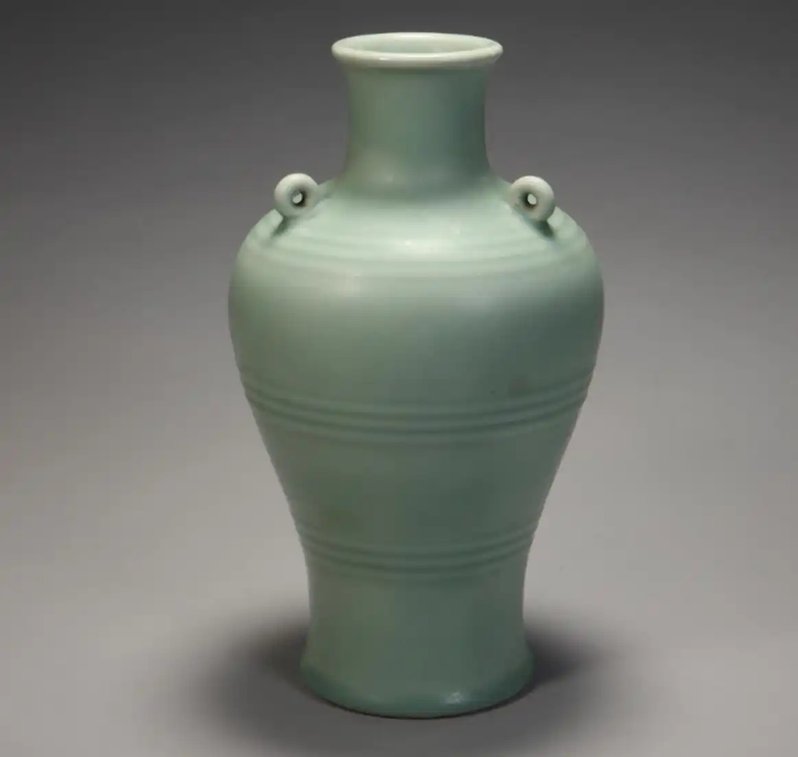 冬青釉,介于上述两种釉色之间,青中闪绿。色彩明度不及粉青般明亮,却也不像豆青那般暗淡,青中泛黄并不明显,最接近于蓝绿中间色,釉面肥润如玉,光泽柔和。