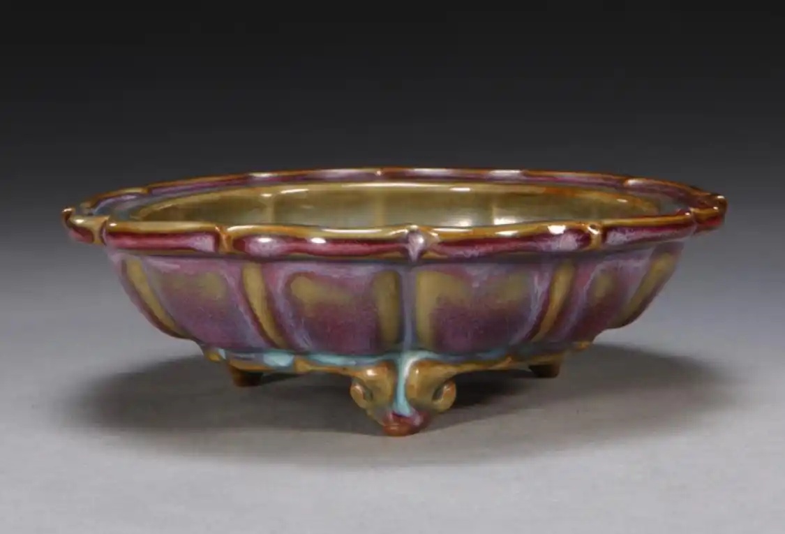 宋 钧窑玫瑰紫釉海棠式三足花盆托