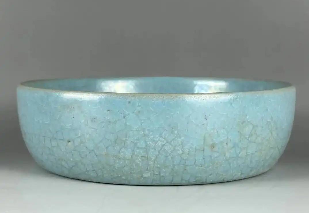 1:汝窑釉的流动十分明显如下图,形状如同流动的棉絮与豆花一般,分布在其中的气泡随处可见,而且气泡的大小差异较大,大者可为小者的数倍至十数倍。大致上气泡的分布较自然,分散於釉层中,但有层次感,呈现出活泼生动的韵动感。