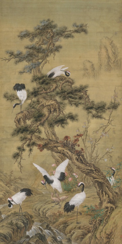 意大利传教士画家郎世宁开启了中西合璧的画院新体。此图以海西法作中国传统祥瑞题材,画成年鹤六只,取“六合”谐音,所绘物象之光影效果尤为引人瞩目,推断作于雍正(1723-1735年)年间。郎氏画鹤作品仅存《松鹤图》轴(沈阳故宫博物院藏)《花阴双鹤图》轴(“台北故宫博物院”藏)与本作。