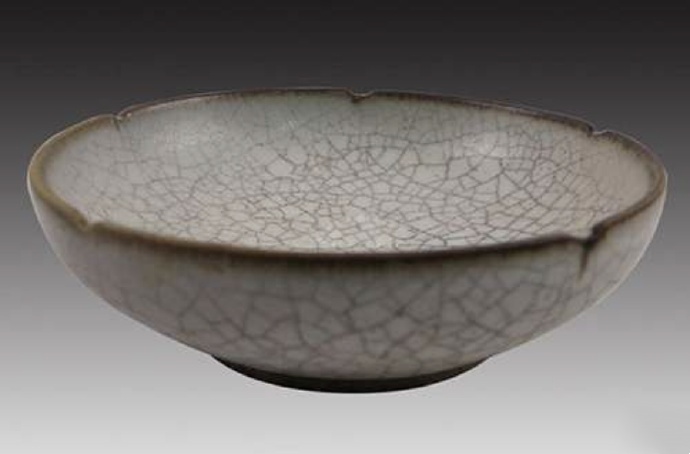 哥窑青釉盘:哥窑窑址迄今未发现,此盘釉色青灰,釉润而失透,布满纵横交错、深浅不一的开片纹,深纹片呈黑色,浅纹片呈黄色,即 “金丝铁线”,口沿因釉垂流变薄隐隐映出紫黑色胎骨,足端无釉呈铁褐色,俗称 “紫口铁足”,造型古朴雅致。